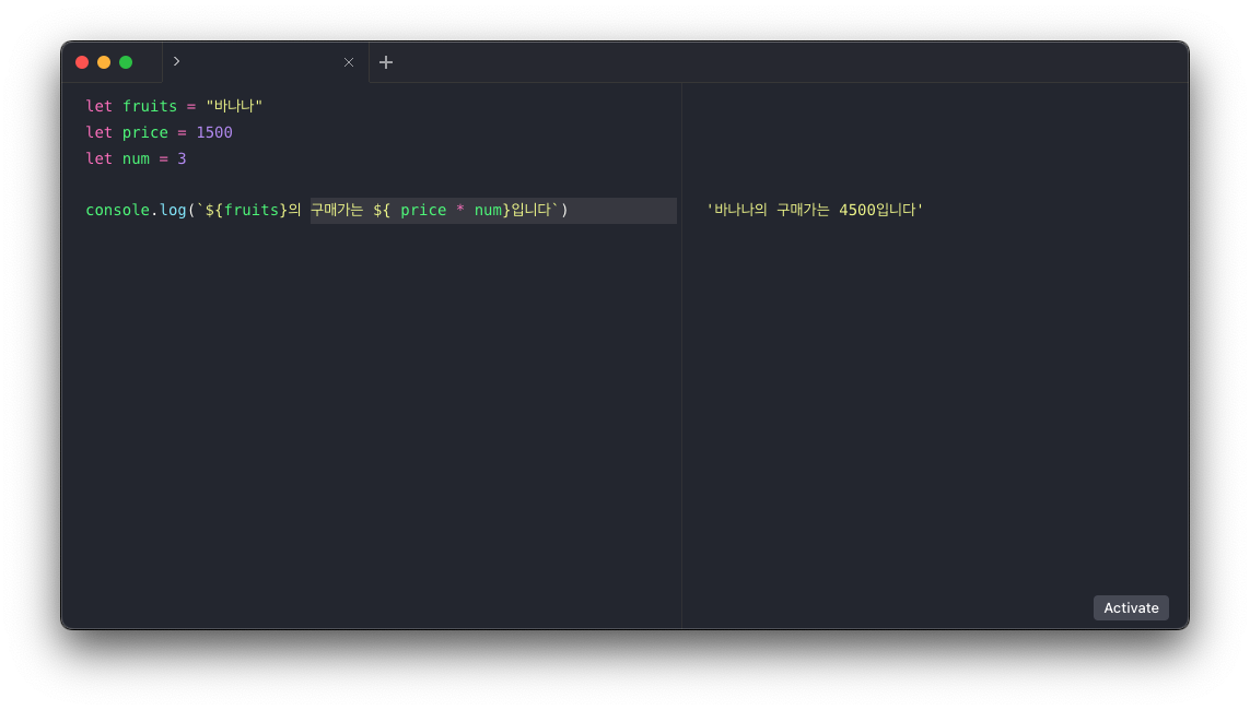 ES6에 새롭게 생긴 문자열 표기법이다 문자열을 감쌀 때 '(작은따옴표) 나 "(큰따옴표)를 사용하지 않고 `` (백 틱)으로 전체를 감싸서