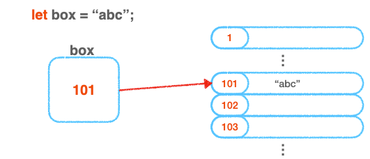 위의 사진처럼 데이터를 재할당하면 "def"가 담긴 주소 값이 box에 재할당 되어서 101 주소에 있는 "abc"는 사라지지 않고 그대로 있어서