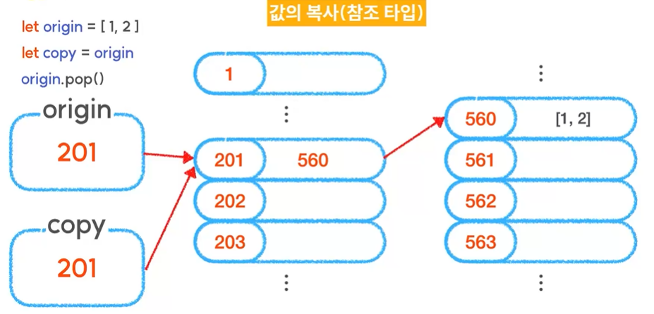 아래 이미지처럼 origin에는 배열이 담긴 주소 값을 가지는게 아니라 배열이 담긴 주소값이 주소값을 origin 변수에 담겨져 있습니다 이러한 구조 떄문에 참조 타입은 복사를 시도했을때 이 배열과 연결되는 560이라는 직접적인 주소값이 아니라 이 주소값을 담고 있는 201번이라는 주소값을 공유하게 됩니다.