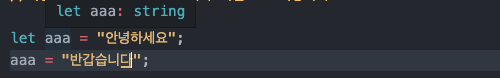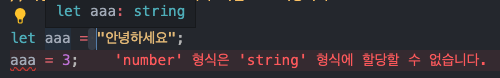 이런식으로 변수에 처음에 문자열으 넣고 변수에 재할당을 할때 같은 타입을 넣어야지 오류가 안나옴 원래는 변수명 뒤에 어떤 타입이 들어갈지 명시를 해주어야 하는데 타입스립트에서 자동으로 변수에 쓰여진 값을 보고 이 변수에는 같은 타입이 들어가는 변수로 인식해서 재할당할때 다른 타입의 값을 쓰면 아래처럼 오류가 난다