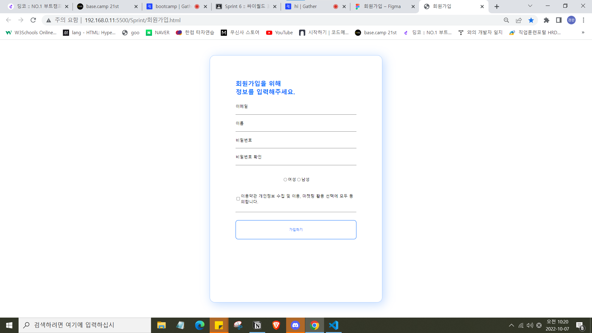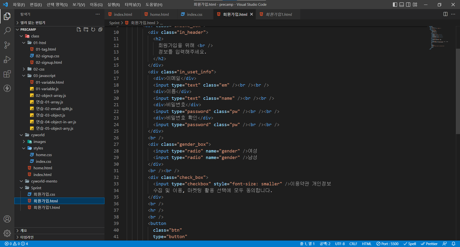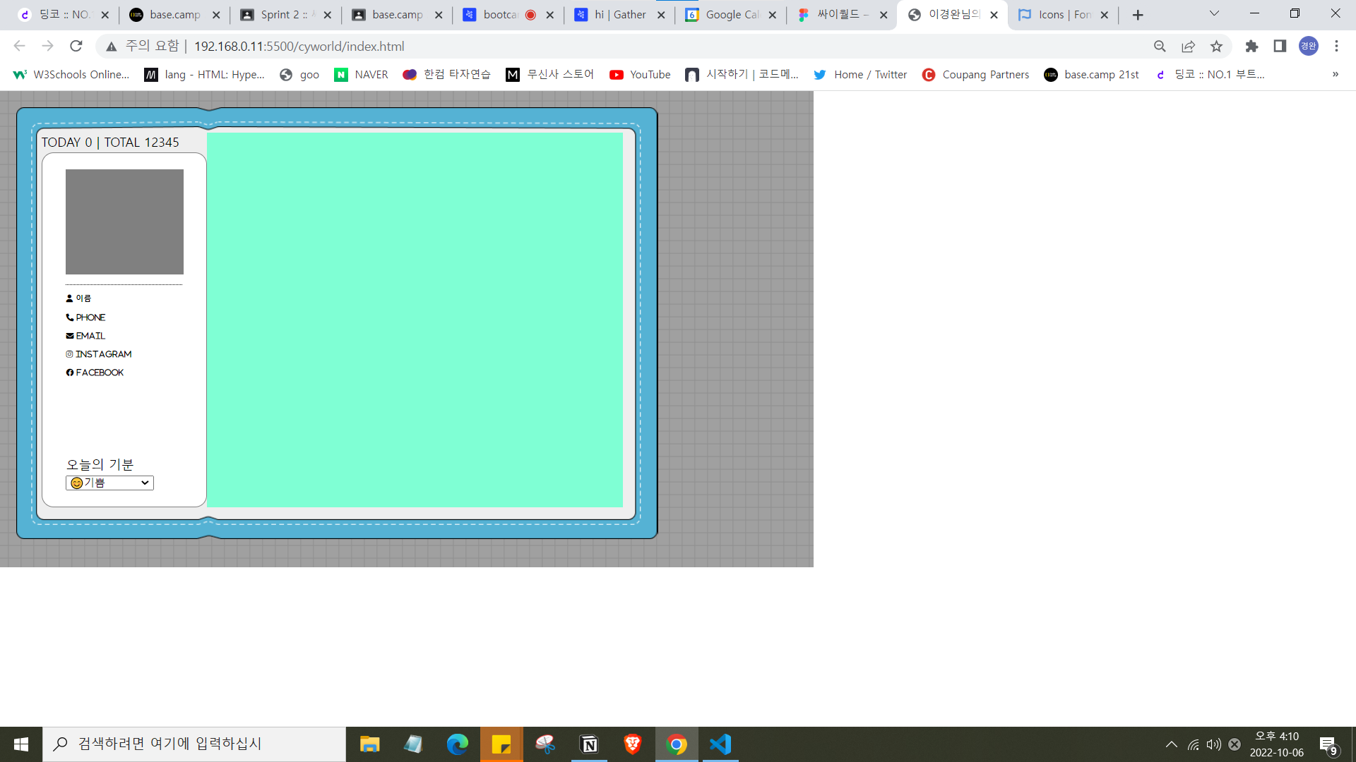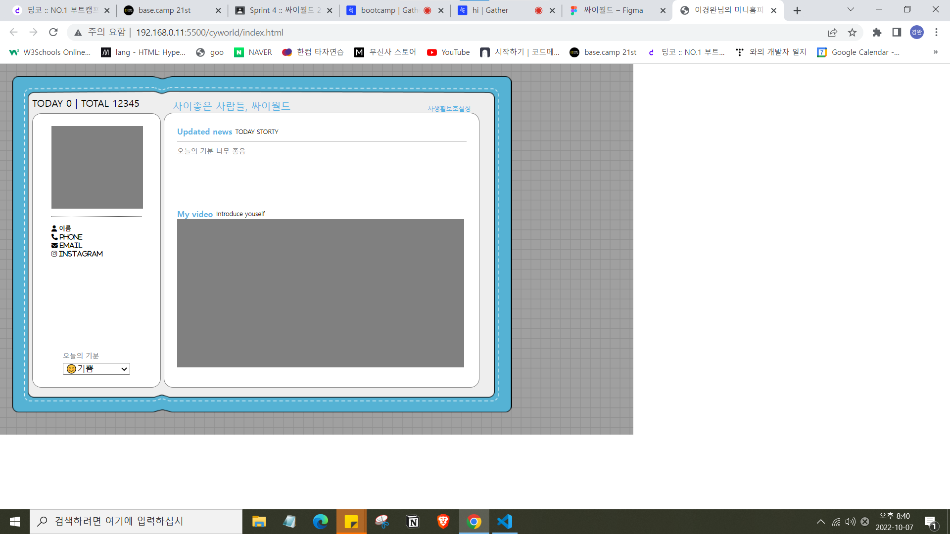 1일차에 웹에대한 기본적인 지식과 코딩에 필요한 프로그램 vscode를 다운받아 설치하고 싸이월드 미니홈피를 만드는거까지 하였다